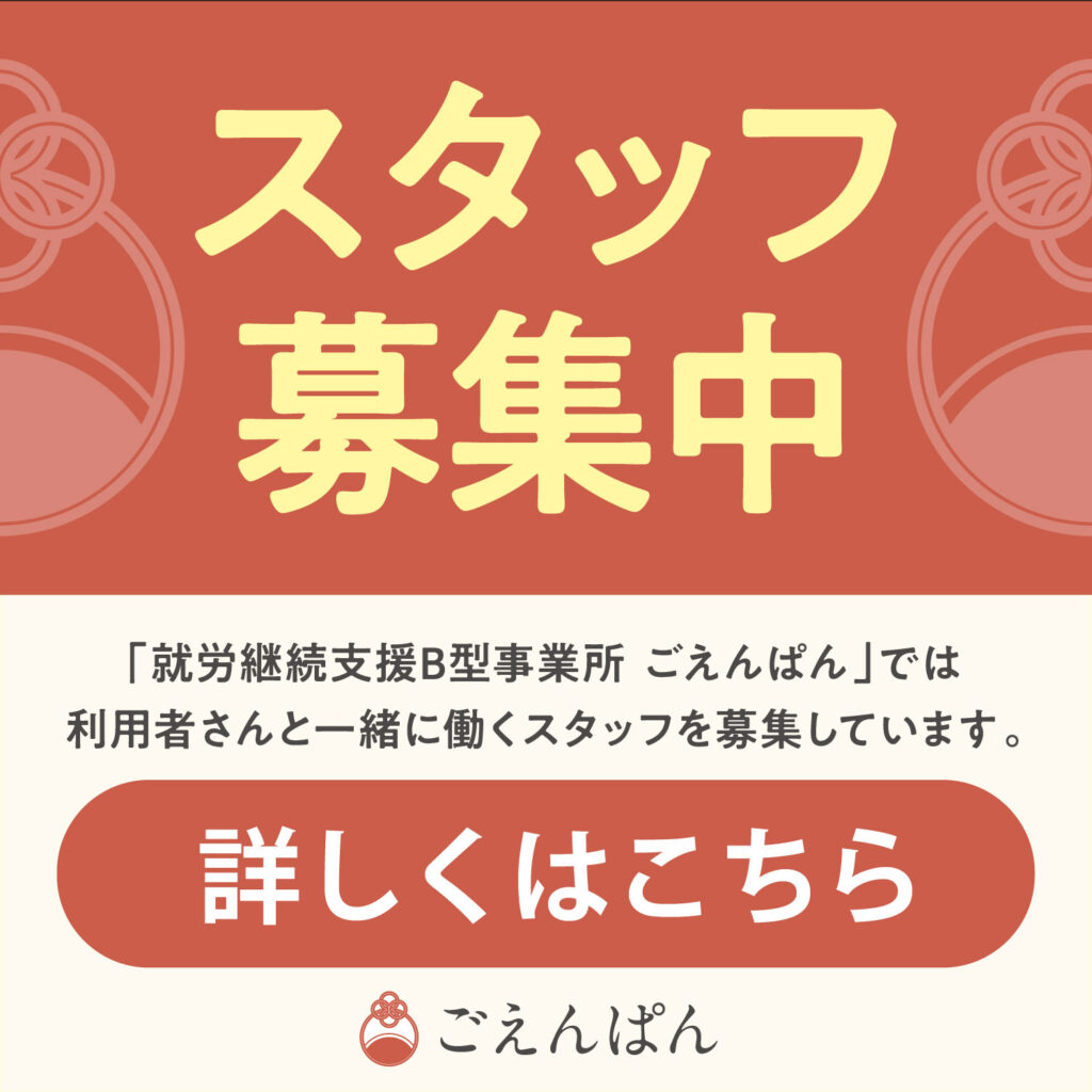 ごえんぱんは、就労継続支援B型事業所です。障がいをお持ちの方で、パン作りをしたい人を募集しています。ご本人または障がい福祉事業者の方は、電話またはメールでお問い合わせください。